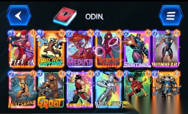 中文卡表包含以下角色:艾丽卡、火箭浣熊、美杜莎、猩红女巫、哨兵、铁心、狼毒、格鲁特、尚气、白虎、蜘蛛女以及奥丁。