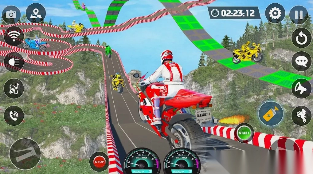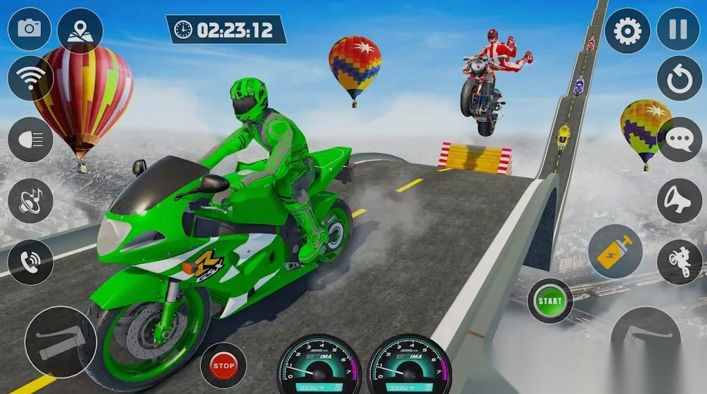 2. 飞跃坡道前,提前调整好摩托车角度,以保证落地时能平稳;在飞跃过程中于空中可触发特技动作,但要留意把控时间,防止出现失去平衡的状况。
