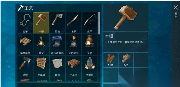 5、建造锤:用来扩展木筏,造成大船,具体作用后面会详细说明。合成:5木板,2废铁