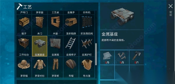 2、以茅草基座制造为例,所需材料为木锤和茅草。因此,要先制造木锤,木锤是制作其他高级物品必不可少的工具之一。制作木锤很简单,仅需1块木板和2份茅草。当收集到足够材料后,在工艺间点击木锤图标,再点击右下角的工艺选项,就能成功制作出木锤。(金属基座)