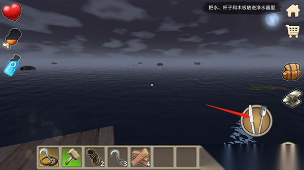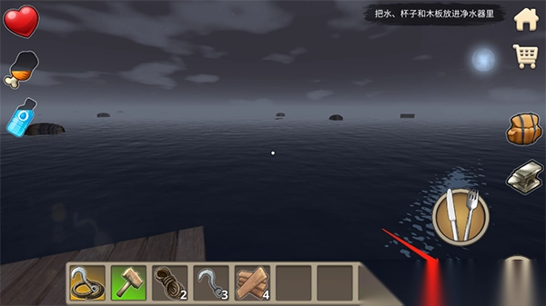 丰富资源收集:海面上物资丰富,通过钩子收集木材、金属、塑料等,用于扩建木筏、制作生存工具,如鱼竿捕鱼、净水器净化海水。