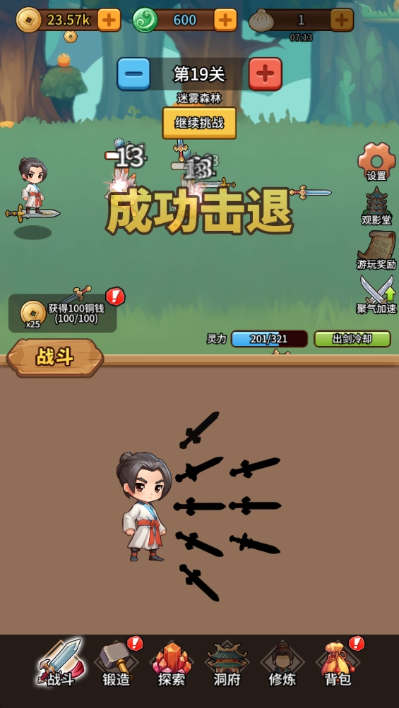 1、战斗系统:一口气挥出几十把仙剑自动打怪赚取财富。