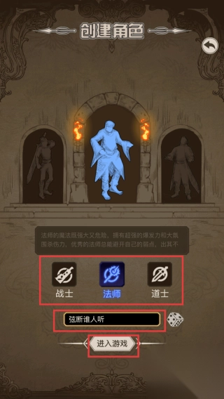 2、从【战士】、【法师】、【道士】这三个角色中挑选一个,输入角色名称,接着点击【进入游戏】。