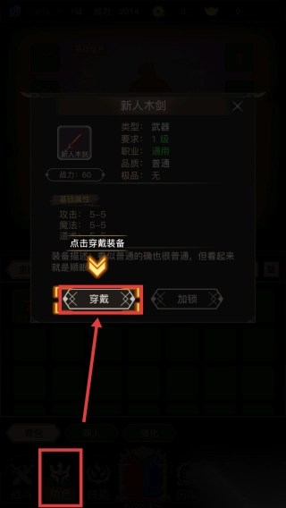 3、只需点击【角色】,就能打开背包。在背包里挑选好装备后,再点击【穿戴】即可。