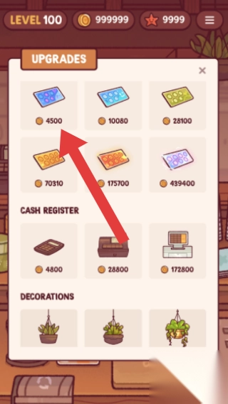 3、游戏界面呈现“UPGRADES(升级)”“CASHREGISTER(收银机)”“DECORATIONS(装饰)”等板块。在该玩法场景中,玩家能够消耗金币来对店铺设施、装饰等进行升级,这属于模拟经营类的养成玩法。