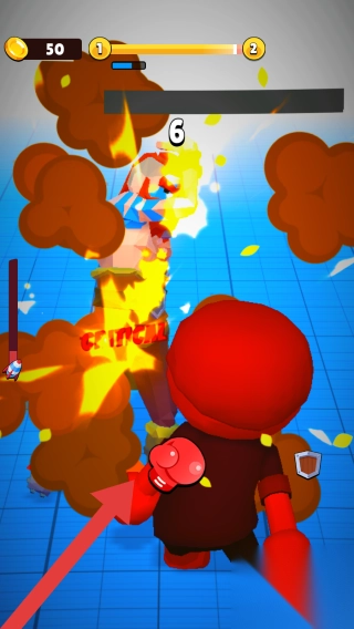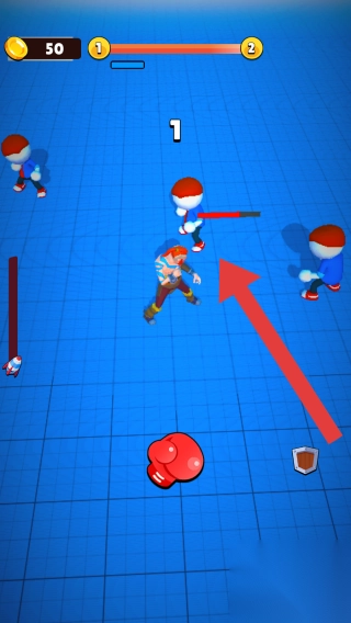 2、金币“50”、上方进度条(等级1-2)、数字“1”(是波数或敌人计数),呈现战斗场景,玩家角色与多个敌人在蓝色网格场地对战。