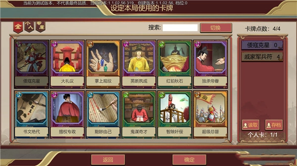 根据本局游戏的玩法决策,提前搭配好【个人卡】和【专属卡】的组合,要注意不能超过点数上限。点击左边的卡牌即可添加至本局游戏中,还支持配装存档方便老爷再次选择。