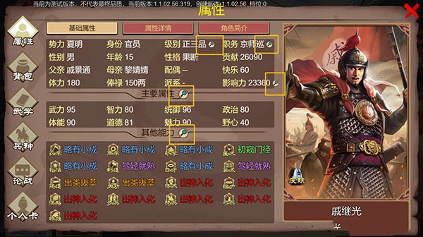点击界面左上角的头像,这里集合了人物属性、背包物品、调整武学、解锁兵种、书籍装配、个人卡等界面。想要了解更详细的信息,可以点击文字旁边的放大镜图标。人物本身主要分为主要属性以及其他能力,游戏内都有详细的文本说明。