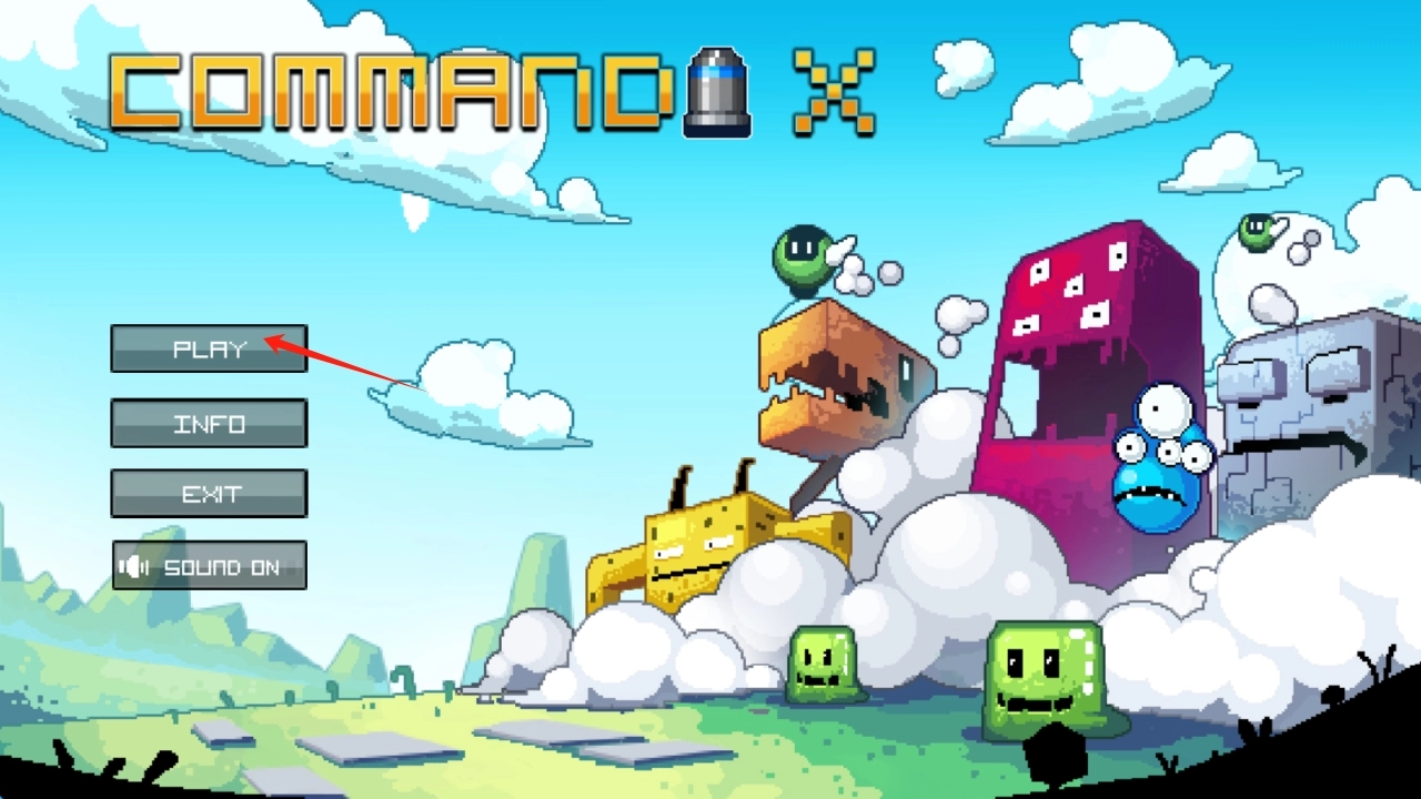 1、在Commando-X界面,点击PLAY,开启像素风格冒险,投身战斗征程,点击按钮开始游戏。