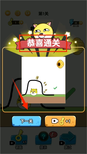 2、进入关卡后,需要通过画线阻止蜜蜂蛰到狗狗,右上方数字代表倒计时。