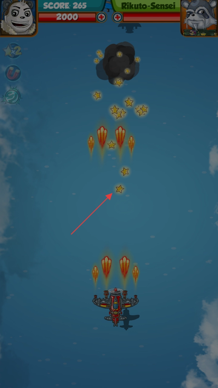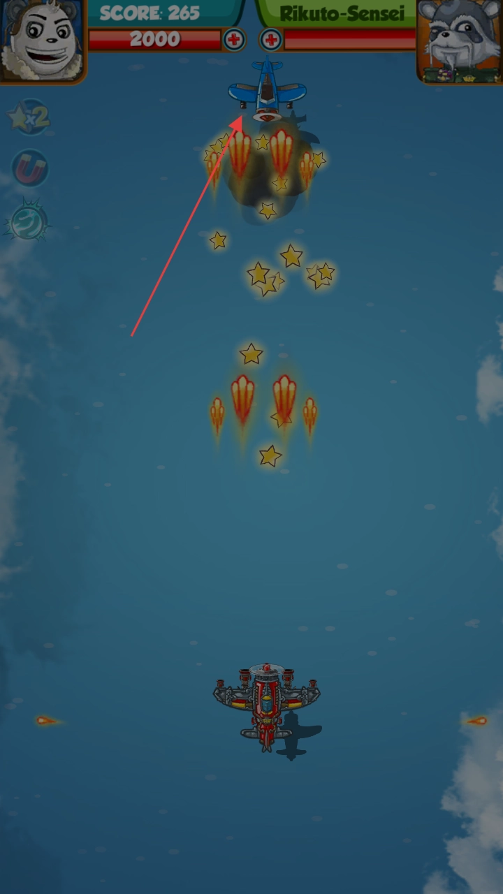 2、飞行中遭遇敌方飞机,通过灵活移动、利用道具(磁铁等),争取高分(SCORE)。