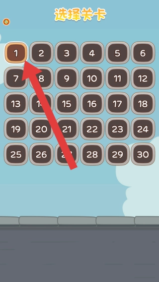 2、实体信息有“选择关卡”标题,以及从1到30的关卡编号,箭头指向第1关,是闯关类的关卡选择场景。