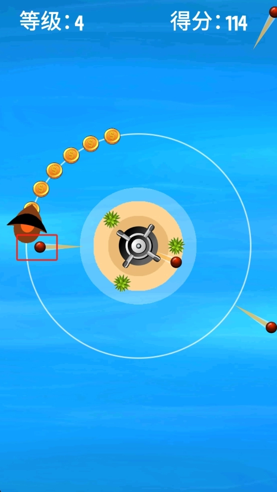 1、进入作品后我们操控红框内的棕色物体沿环形轨迹移动,收集金色硬币,同时避开红色球体,维持绕圈节奏以提升等级。