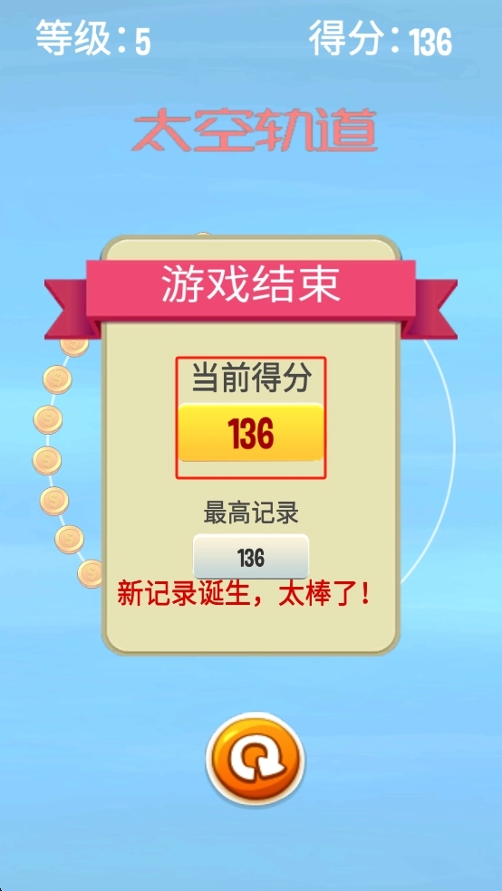 3、被炮打中游戏就结束了,界面显示当前得分136且打破最高记录,点击下方橙色重置按钮,即可重新开始挑战。