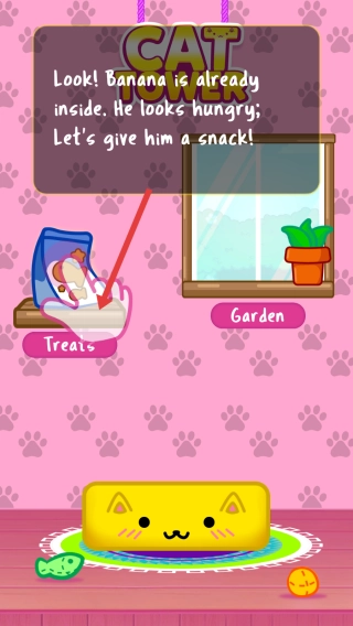 3、到了室内的场景,看到提示点击Treats的选项,给里面的宠物喂食,满足其对食物的需求。