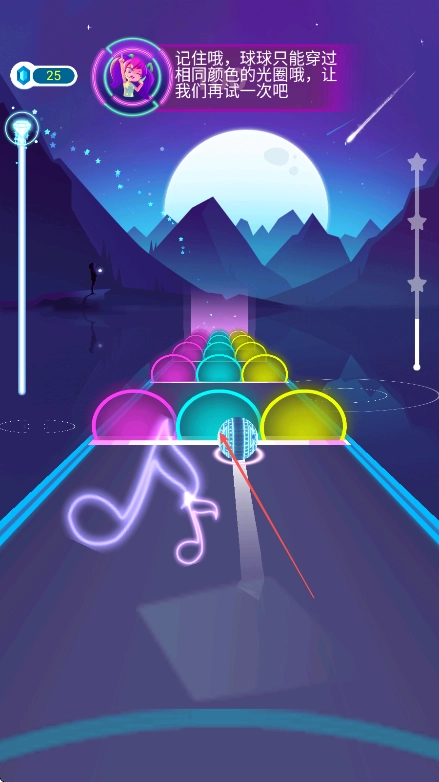 3、始终依据光圈颜色,灵活变换球球的移动方向,伴随着音乐节奏,顺利穿过一连串光圈,完成关卡挑战,赢得奖励。