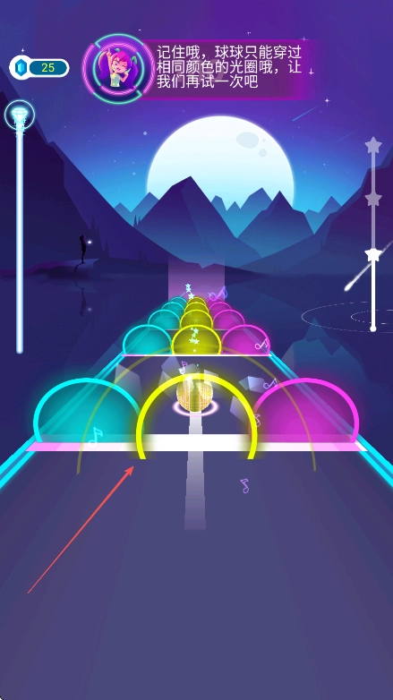 2、当看到前方出现彩色光圈时,留意游戏给出的提示,操控球球穿过和自身颜色一致的光圈,例如粉色球球就穿过粉色光圈。