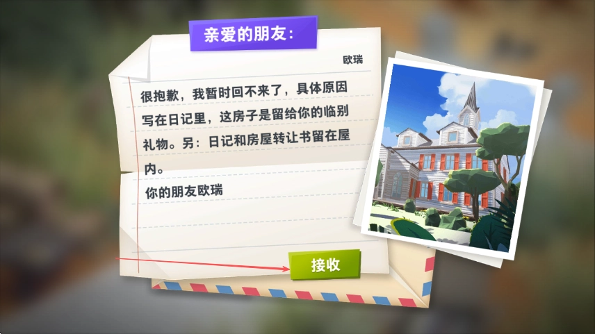 1. 进入游戏后,看到朋友欧瑞的信件,点击接收按钮,从而获取房屋。