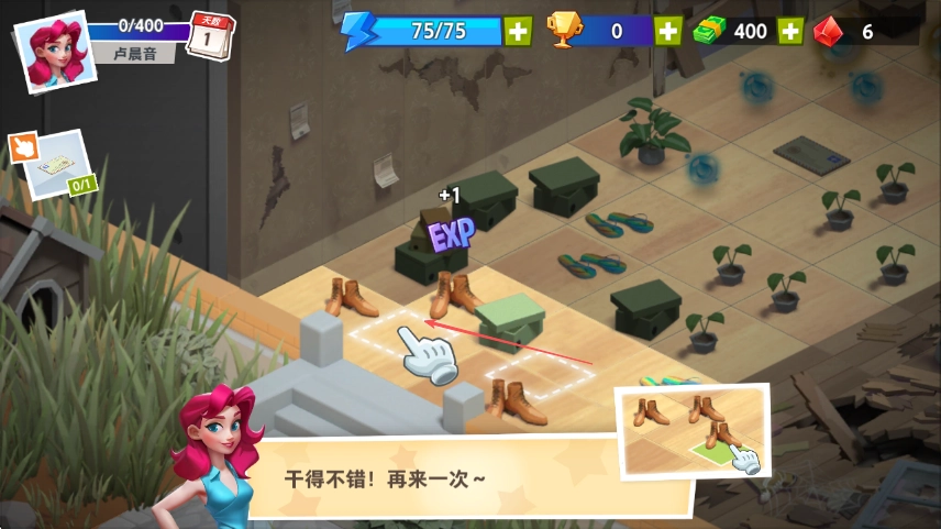 2. 操控角色在屋内点击相同物品进行合成,以此获取经验值,例如点击靴子进行合成。