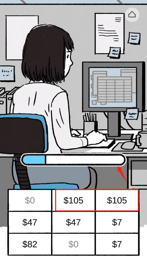 6、抵达公司咯,准备全身心投入工作啦。在操作中,点击数量相等的两种$钞票,一直点到进度条完全填满,今天的工作就算大功告成啦。