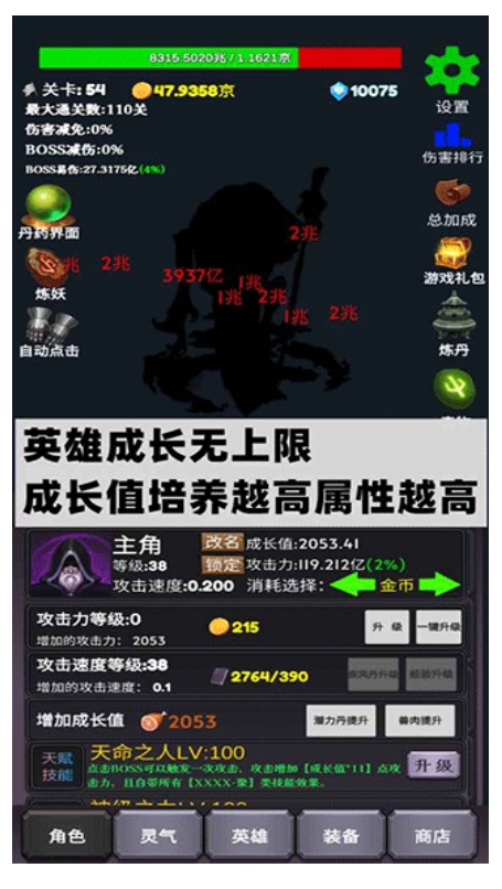 2、这并非只是单纯数值堆砌的放置游戏,玩家需要合理搭配角色技能与装备,从而体验到更多精彩的游戏冒险。其全新的游戏玩法,会带来相当刺激的感受。好玩的游戏战斗都在等待您去解锁,哪怕是放置挂机,同样可以实现解锁。
