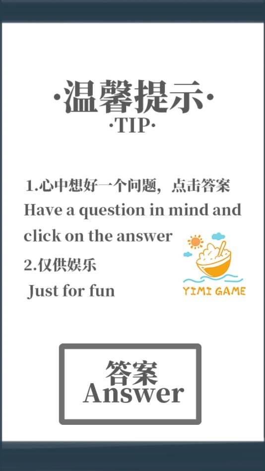 相信不少人都接触过答案书,当你心中有疑问时,随机翻开一页就能看到回答。“给我一个答案”便是类似的游戏,玩家在脑海中思索一件困惑之事,点击获取答案,看看能否得到一些解答与帮助,说不定这里的答案能为你指引方向。