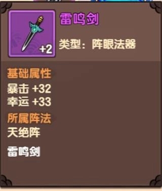 雷鸣剑,作为天绝阵的阵眼法器之一,能赋予使用者暴击与幸运属性。