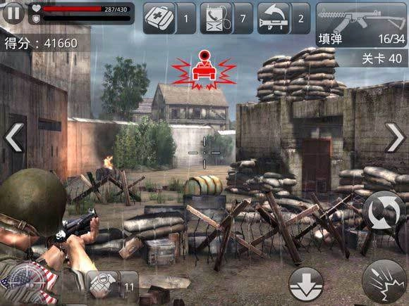 流程:主要是引导大家体验游戏的教学关卡,玩家将扮演3个伞兵空降师中的一名普通士兵。首先,熟悉通过触摸屏幕转换视角的操作,随后点击屏幕右上角的“拳头”标志,实现降落至地面。接下来,会对游戏中的各个基本标志进行介绍,之后讲解射击及射击模式。再之后,介绍如何利用墙壁作为掩体进行攻击。完成掩体攻击介绍后,便是手榴弹使用方法的讲解,注意要把手榴弹全部投掷出去。紧接着,介绍获取道具的相关内容,捡起火箭炮的同时消灭一辆坦克。