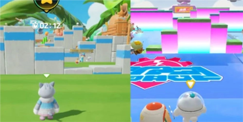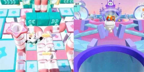 元梦【惊奇探险】由各类障碍元素堆叠而成,其亮点在于在Y轴方向设计了多层赛道。通关路径存在多种选择,走上层赛道速度更快,即便从上层掉落,也能够借助下层赛道继续前行。实际上,这种设计在蛋仔的许多地图中都能见到,例如【气球城堡】这张地图就十分典型,上层跳板可实现快速通关,不慎掉落后,还能依靠下层跳板继续攀爬。