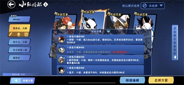 最简单的上阵方式为,首先我们得挑选两位作战忍者来参与本轮战斗。就好比在33噩梦石图的情况下,我会选用鬼狩来跑图、绯斩负责打boss以及伊鹤进行接力,所以在小队搭配方面我会这样安排: