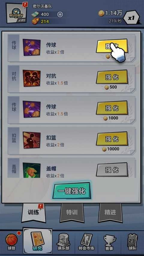 在底部的“球技”选项里,借助解锁传球、对抗、扣篮、盖帽等训练项目,提升球员在比赛中的对抗能力。