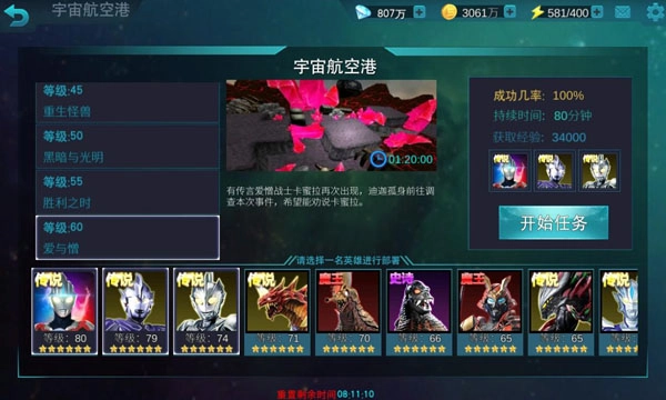 宇宙航空港的玩法极其简单,奖励也绝对物超所值。游戏里的航空港共计12个任务,这些任务的奖励一致,均为经验与英雄碎片。任务等级越高,所获经验值与英雄碎片奖励就越多。参与航空港任务无需进行战斗,只需挑选合适的英雄,静候倒计时结束,便可收获奖励。