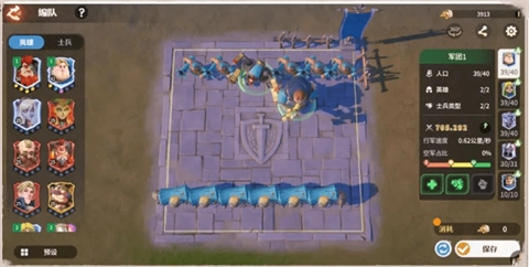 1、于军团编辑界面,领主能够安排英雄与士兵上阵,对站位进行调整,还能查看军团属性等。