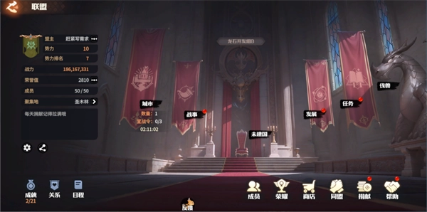 3、加入联盟:联盟是游戏里独一无二的领主组织,联盟功能开启后,应尽快加入或创建联盟,不必等待联盟中心开放。加入联盟后,留意盟友的活跃情况,再决定是否继续留在该联盟;推荐优先选择人数较多的联盟加入,借助盟友间的相互扶持,能实现快速发展,解锁更多游戏玩法。