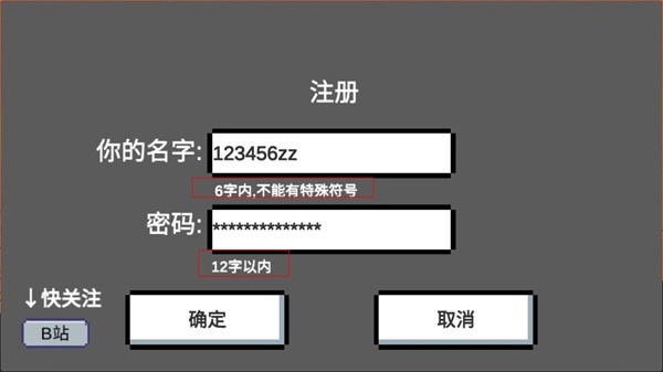 3、接下来输入一个名字与密码,需注意名字应在6个字符以内,且不能包含特殊符号,密码则要在12个字以内。