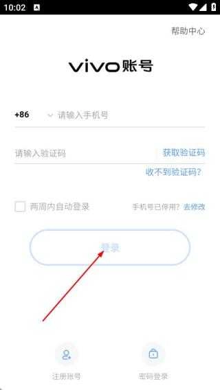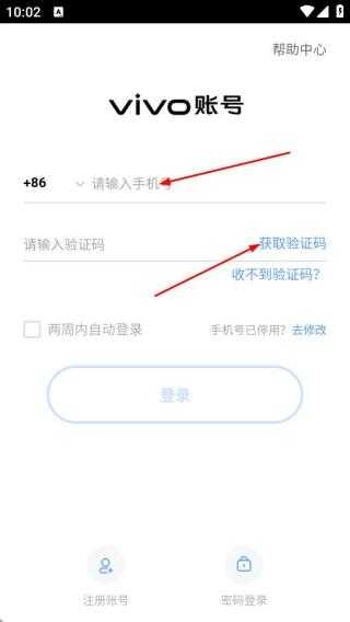 3、要是没有vivo账号,点击【注册账号】进行创建;要是想用密码登录,就选择【密码登录】来切换登录方式。
