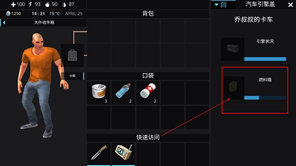 7、皮卡同样需要燃料,只需随身携带。当对准汽车引擎盖时,按下“使用”按钮,即可打开特殊菜单。借助这个菜单,你不但能够修理汽车,更关键的是还能给汽车加油。