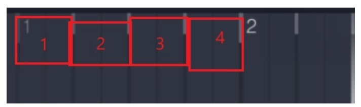 接着我们发现,简谱里每一个小节都包含四个数字,与此同时,在调教界面中,每个数字对应的界面恰好有四个大格。