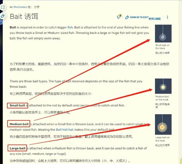 其中“中鱼饵”的获取方式为:钓到小鱼后,既不要点击“sell”将其卖掉,也不要在鱼竿甩到身后时松手(因为这样会存鱼),而是直接把小鱼再次抛出去,小鱼落入水中后会自动变成“中鱼饵”,利用它就能钓到中级鱼。
