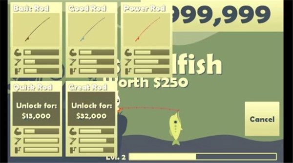 正常情况下,玩家需要依靠钓鱼赚取金钱,才能购买鱼竿。但在我们这里,拥有999999美金,因此能够直接将鱼竿全部买下。