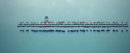 2、进入游戏后,画面如图所示,点击水面即可生成房屋建筑。