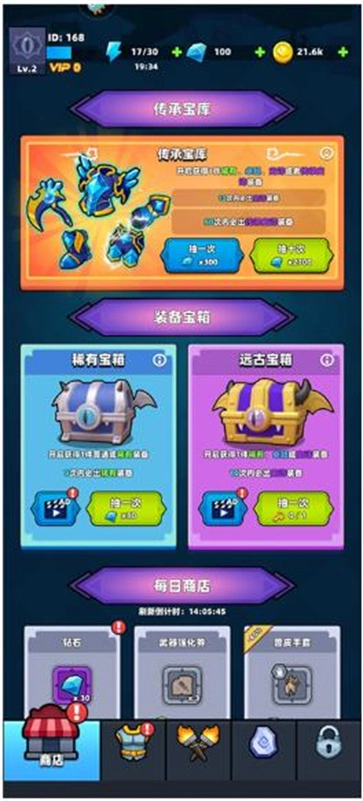 在商店里,能够通过开启宝箱来获取装备。装备的品质分为稀有、卓越、史诗以及传承史诗这几种,装备的品质越高,其属性也就越强。