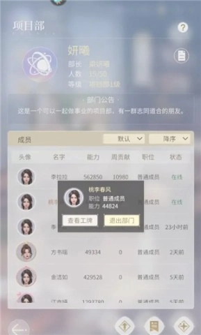 4、寻找到自己的角色名称,点击该名字,此时会弹出菜单,在菜单中选择“退出部门”选项。