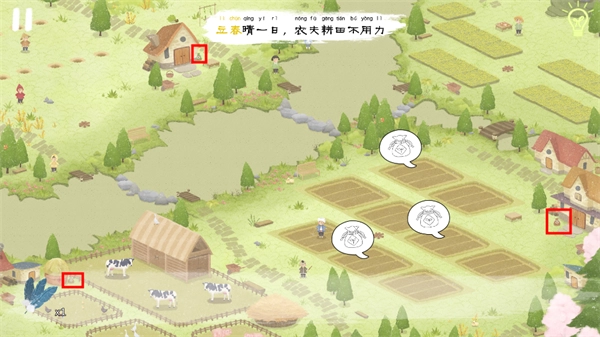 立春已至,然而左下角的农民大叔却满脸愁容,只因田地上方乌云重重。轻点乌云,待其散开后再次点击,直至乌云彻底消失不见。