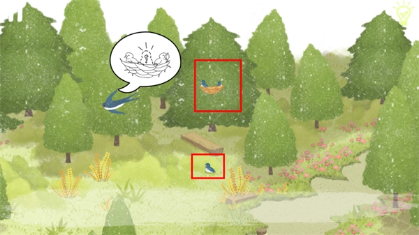 请点击地面红框位置的小燕子,随后从左下角物品栏中将“小燕子”拖至红框处的鸟身旁,如此便成功协助了燕子妈妈。完成操作后,即可获得“燕子羽毛”。