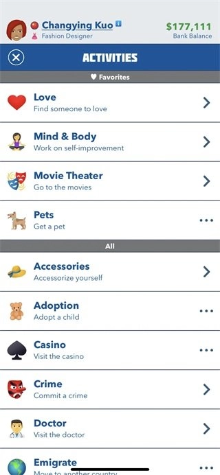 5、在Love选项中,功能是寻找恋爱对象;Mind&body选项里,包含健身、散步、打理花园、看书等活动;Pets选项中,不仅能够购买或收养各类宠物(这可是最受欢迎的玩法!),还能收养孩子,参与赌场赌博,实施各种犯罪行为,甚至可以移民到其他国家。