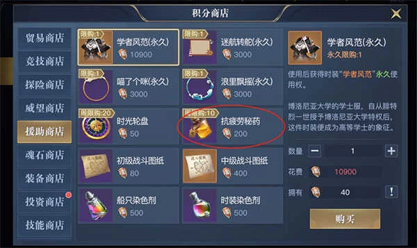 鉴于援助值每周仅能获取2000,且抗疲劳秘药获取途径有限,建议玩家兑换10个抗疲劳秘药。