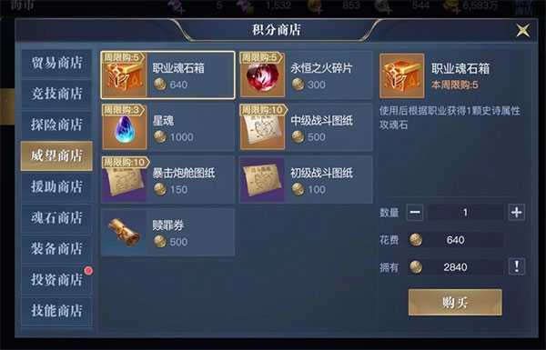 建议各位玩家兑换每周限购的材料,只要玩家持续参与这些威望活动,所获取的威望币便足以完成全部兑换。