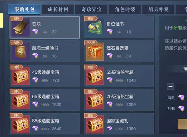 对于玩家,建议优先使用相关资源来兑换每周的30个魂石自选箱以及造船材料,毕竟这是平民获取这些材料的关键途径。要是资源还有剩余,那么推荐玩家兑换诸如铁块、爵位证书这类打折材料。最后,建议玩家抽取每周的两个七折五连抽礼包。