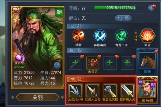 到了游戏的中后期阶段,高阶武将彼此间的较量,常常得借助神器所具备的特殊属性加成才能分出胜负。每位武将能够佩戴4种各异的神器,而神器的特殊属性存在武、智、统方面的偏向。也就是说,有些神器对于武力型武将而言更为适配,有些神器更契合智力型武将,还有些神器则是统帅型武将的优选。